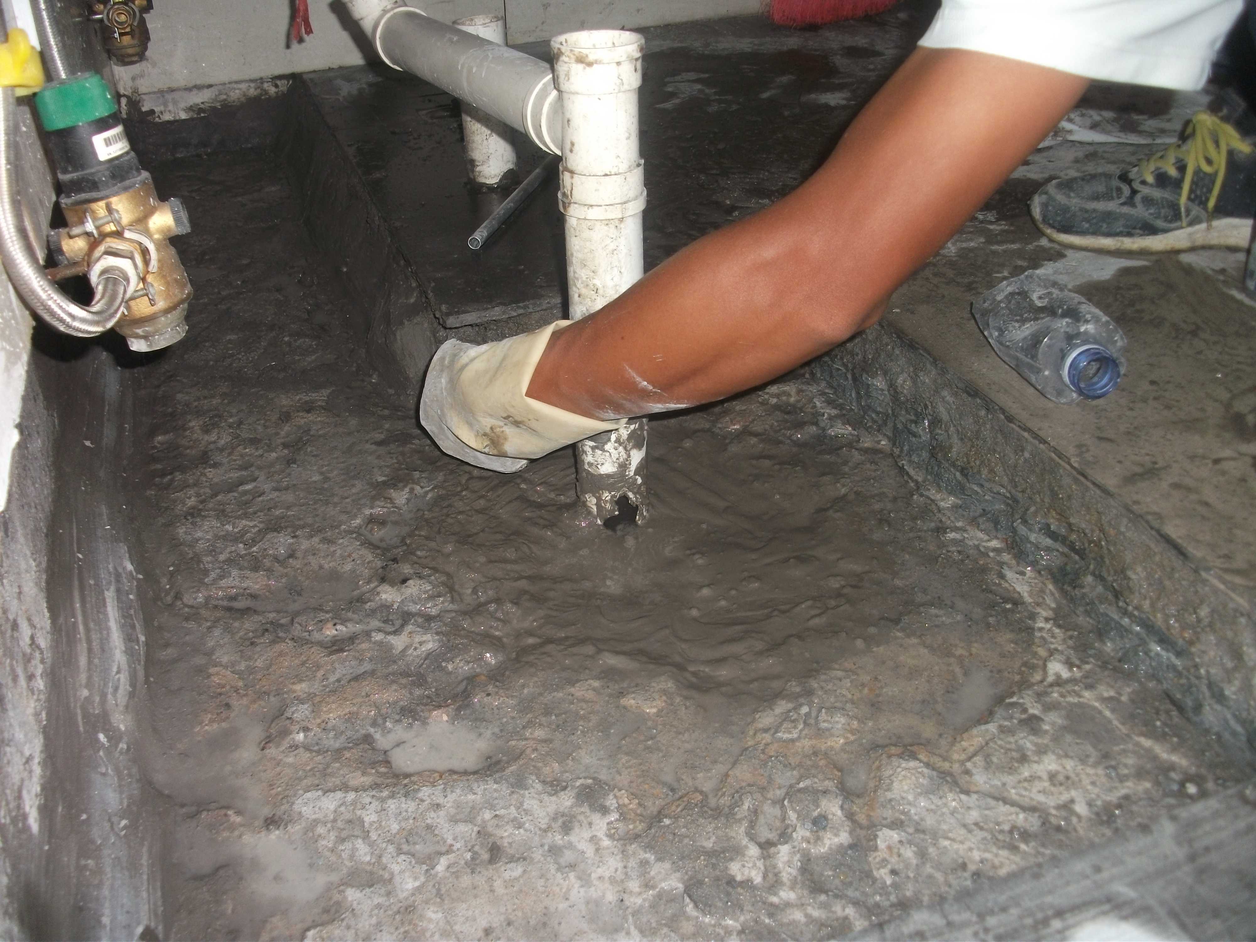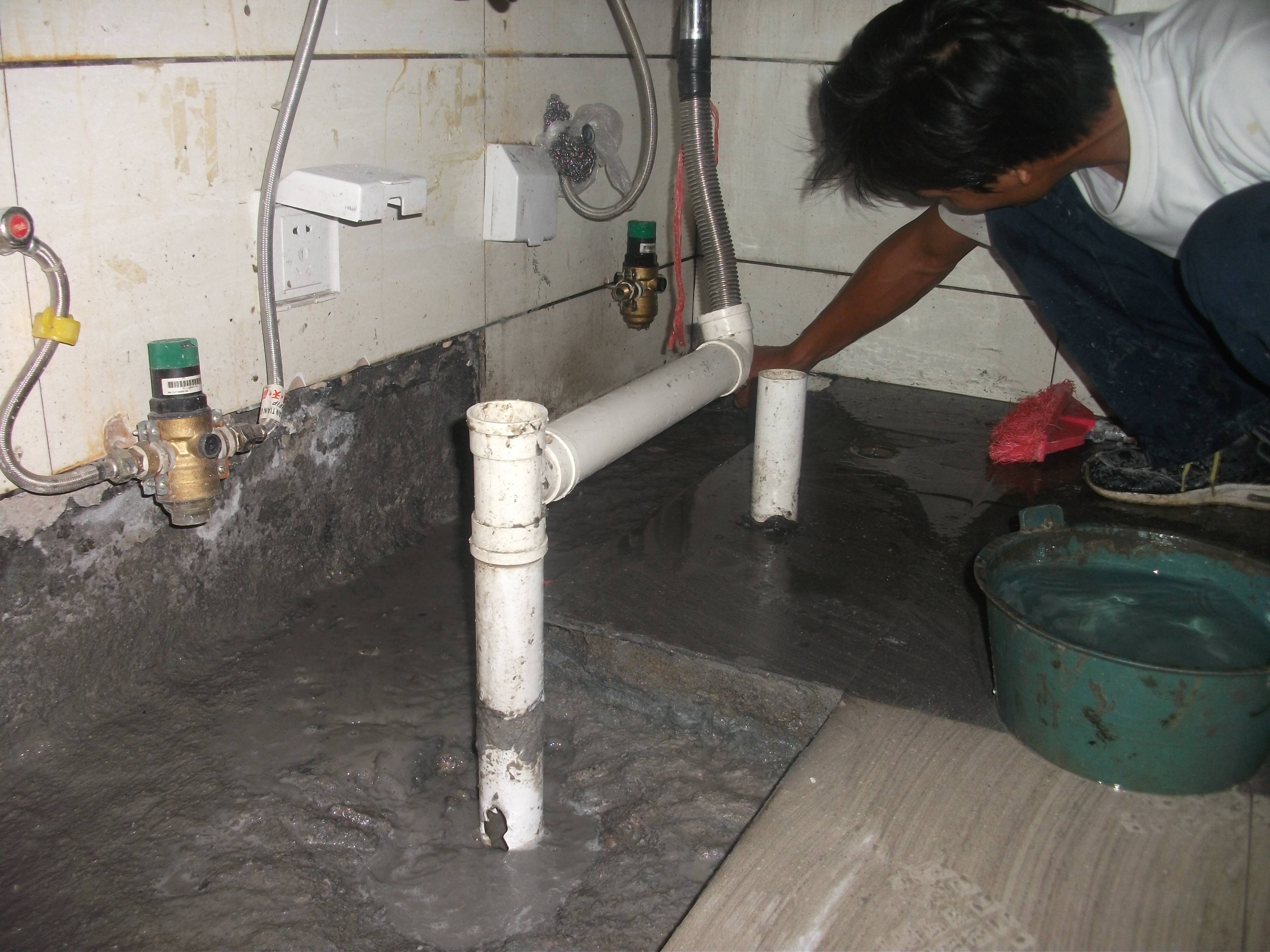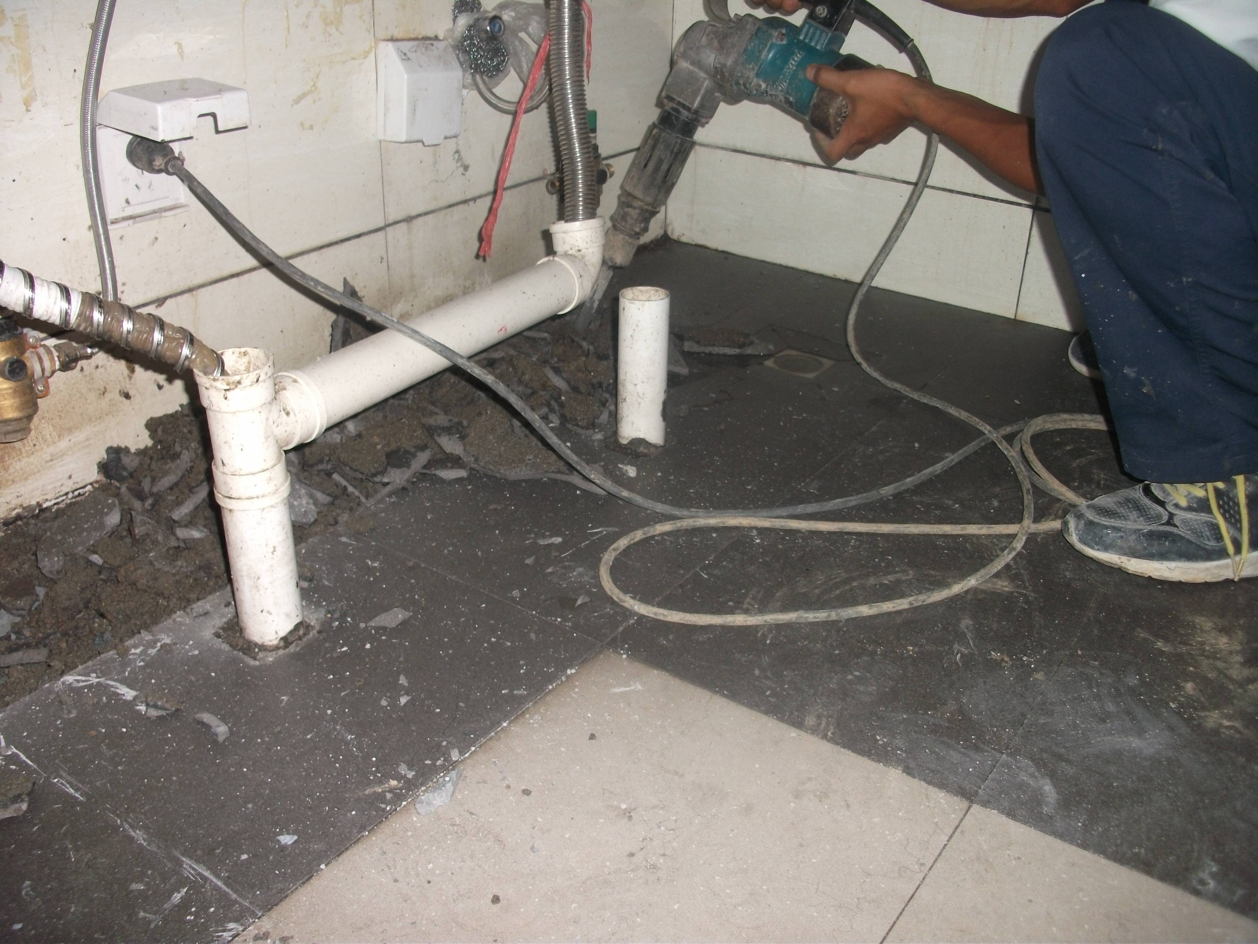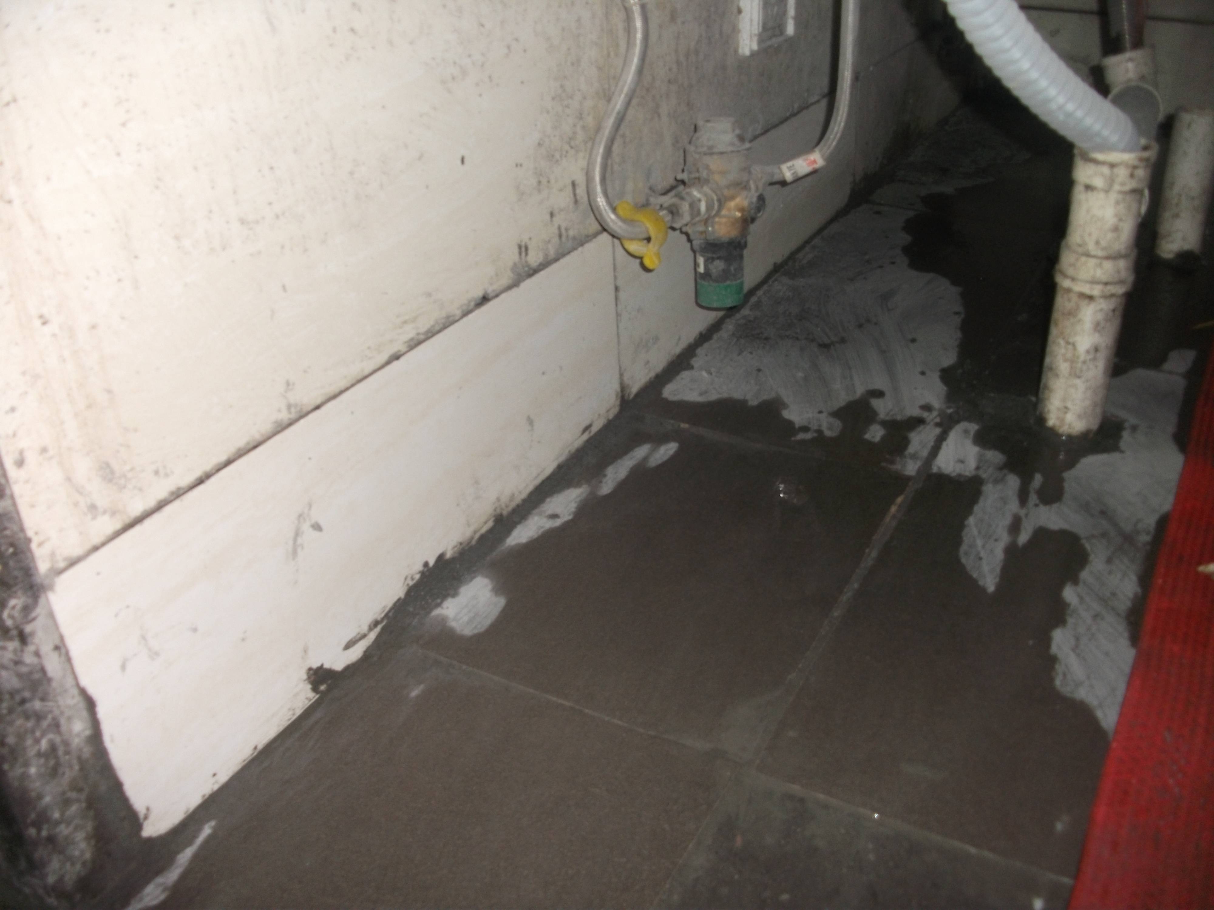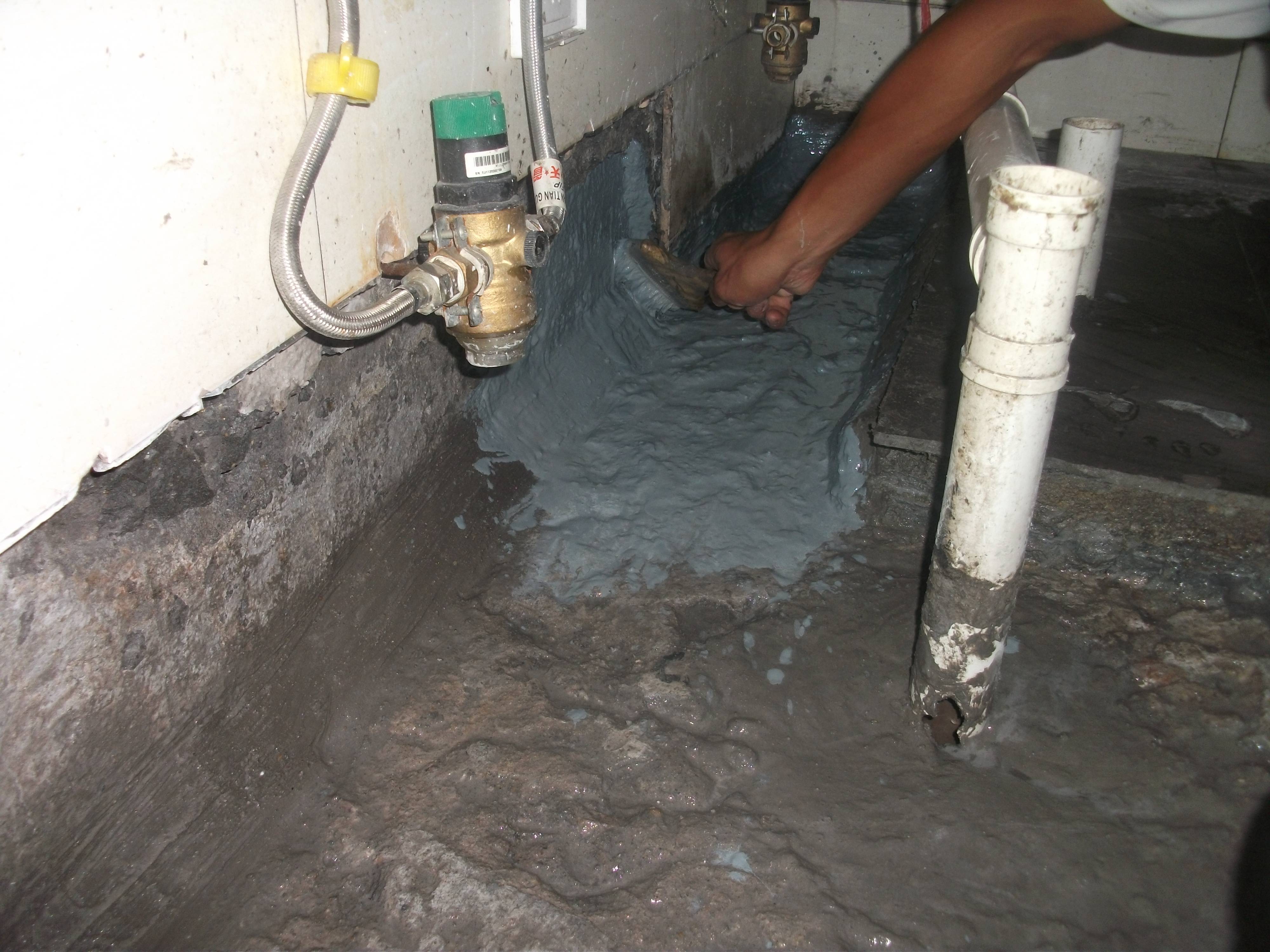 本案例為廣園路二樓大型超市公共衛(wèi)生間滲水,衛(wèi)生間位于超市中間,周邊不同情況滲水,樓下無(wú)滲漏。根據(jù)現(xiàn)場(chǎng)情況,公司給出的防水補(bǔ)漏方案為四周圍依托厚墻體做防水、加高地面存水能力,并利用原衛(wèi)生間地漏進(jìn)行排水,堵排接合的防水補(bǔ)漏方案。具體為人工開(kāi)鑿衛(wèi)生間四周至原結(jié)構(gòu)面,陰角開(kāi)“V”形槽,清洗封堵、加強(qiáng)防水層、整體防水層、三途并設(shè)二次排水。